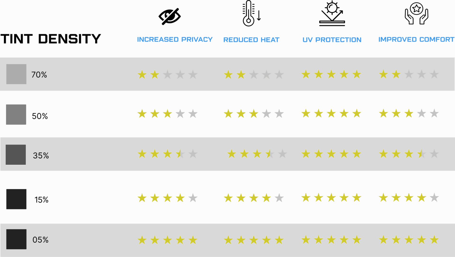 Tinted windows provide you and your passengers with more privacy. They make it more difficult for strangers to see inside your vehicle, securing your possessions and giving security while driving or parking in public places.